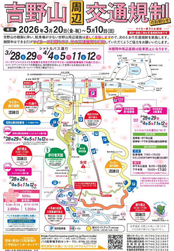 吉野山の観桜に伴い、駐車場が少ない吉野山周辺道路は混雑いたします。また交通規制については時間と区間の規制に加えて、3月28日/29日/4月4日/5日/11日/12日はシャトルバスが運行されます。世界遺産吉野山の桜をお楽しみいただくためにご理解ご協力の程宜しくお願い申し上げます。